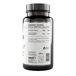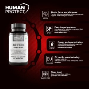 HUMAN PROTECT Caffeine Anhydrous delivers 200mg of pure caffeine per vegan capsule, formulated to support mental alertness, focus, and endurance performance. Ideal for individuals seeking natural support for concentration and physical exercise. Manufactured in the EU to the highest quality standards. Take 1 to 2 capsules daily based on individual needs.
