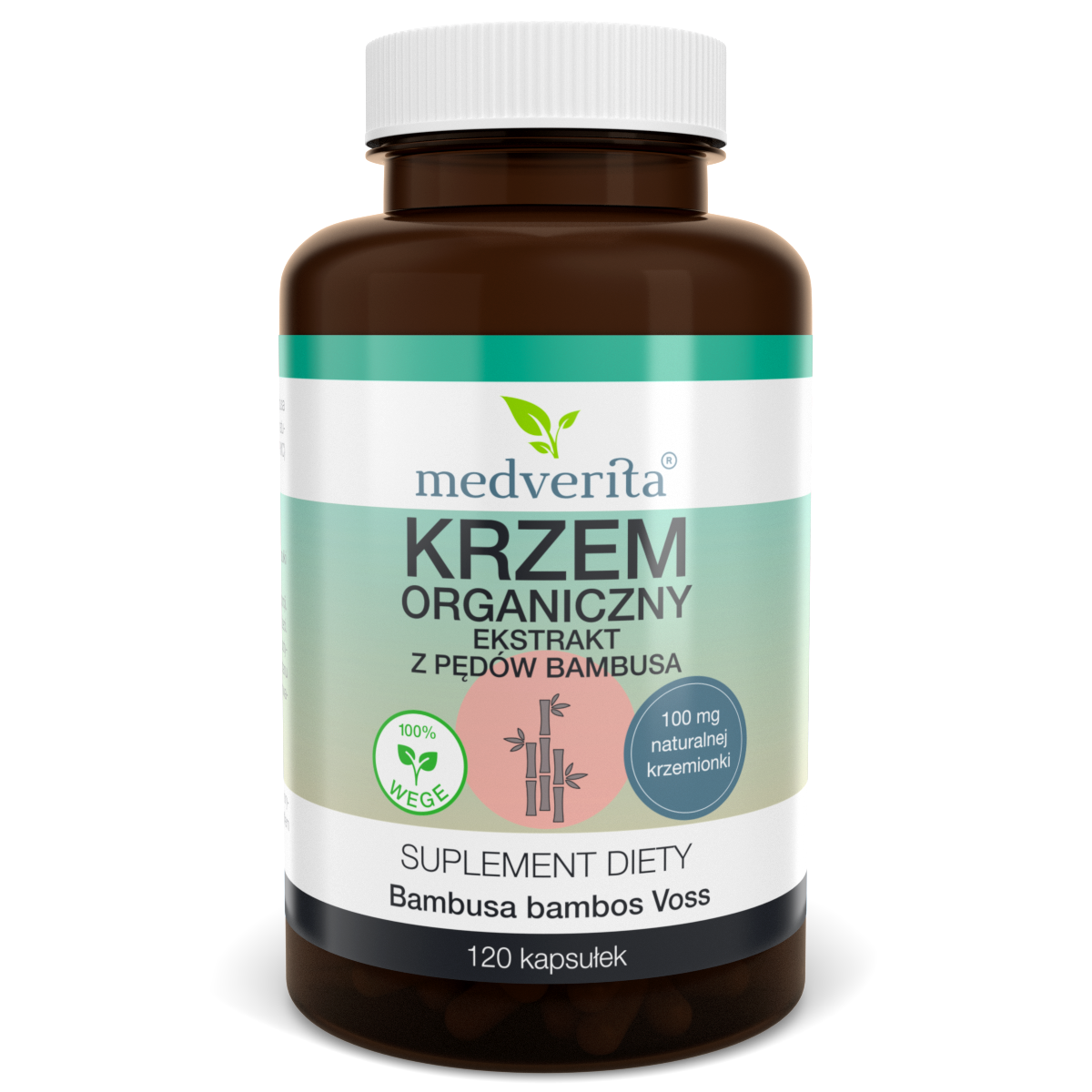 Medverita Krzem Organiczny to wysokiej jakości suplement diety zawierający organiczny krzem pozyskiwany z ekstraktu pędów bambusa standaryzowanego na 75% krzemionki (SiO₂). Każda kapsułka dostarcza 100 mg czystego krzemu roślinnego, który jest ważnym mikroelementem wspierającym kondycję włosów, skóry, paznokci, a także zdrowie tkanki łącznej i kości.